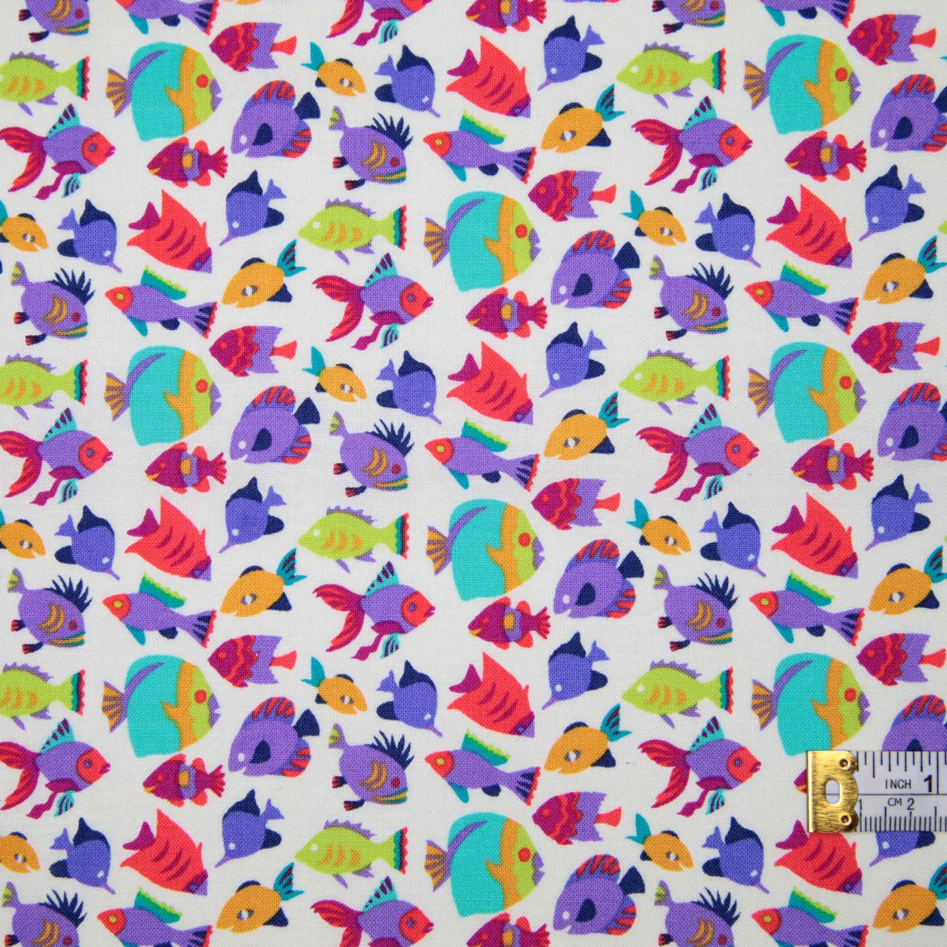 Off white, soft cream background with a myriad of brightly coloured, and packed, fish