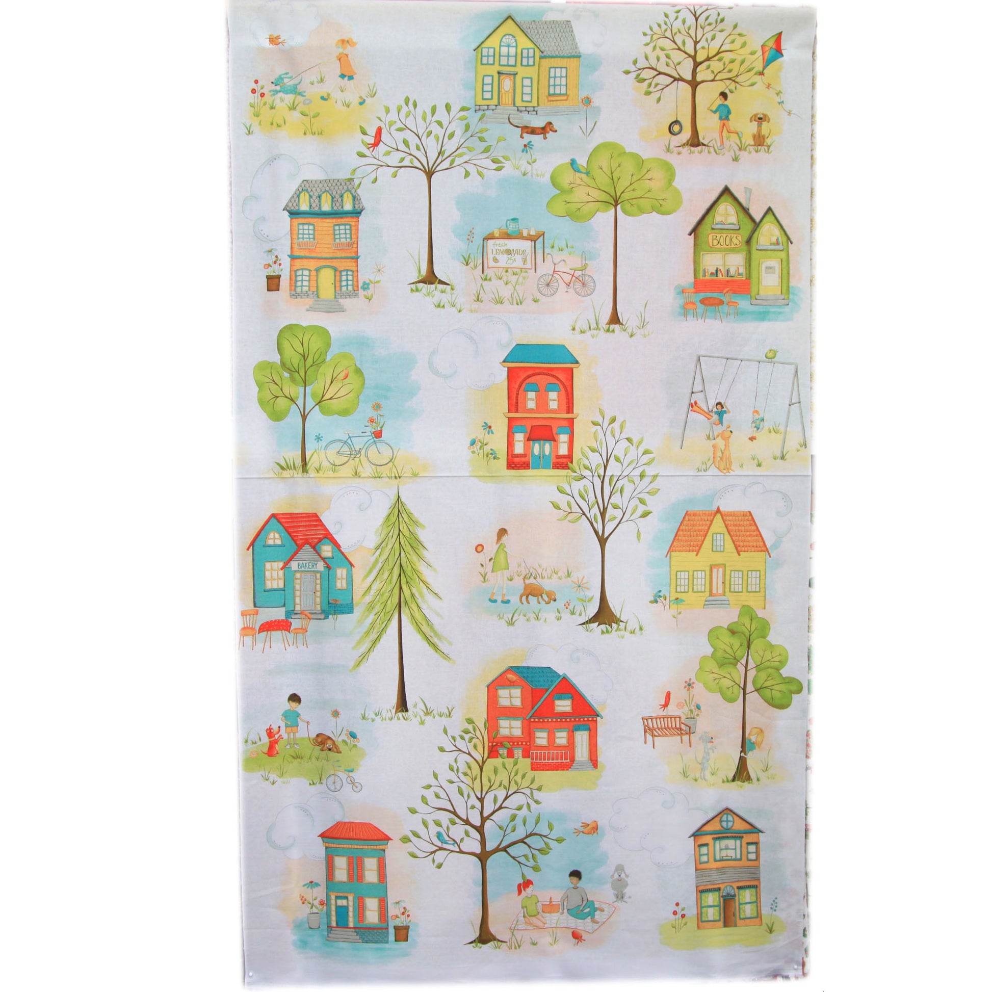 Off-white background with 18 squares of neighbourhood scenes: dog walking, lemonade stand, trees, houses