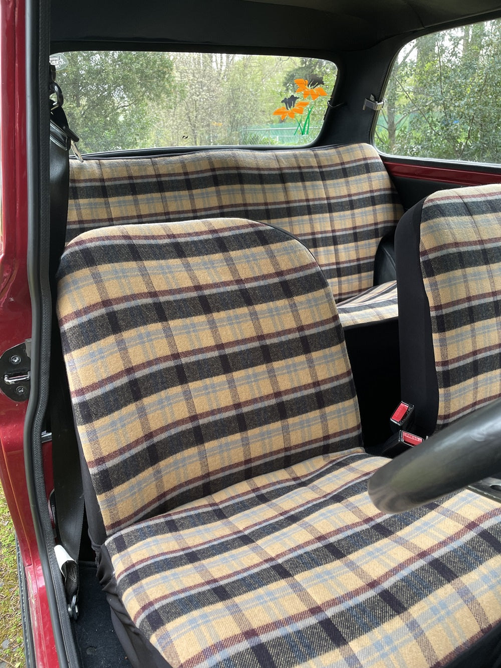 Warm brown, orangey beige with marooon and black striped tartan - will suit many classic mini colours