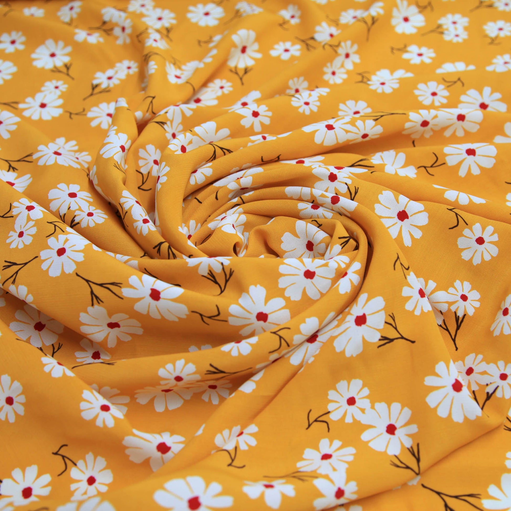 Printed viscose with a pumpkin soup yellow background. White flowers with red centres. This has a slightly textured finish.