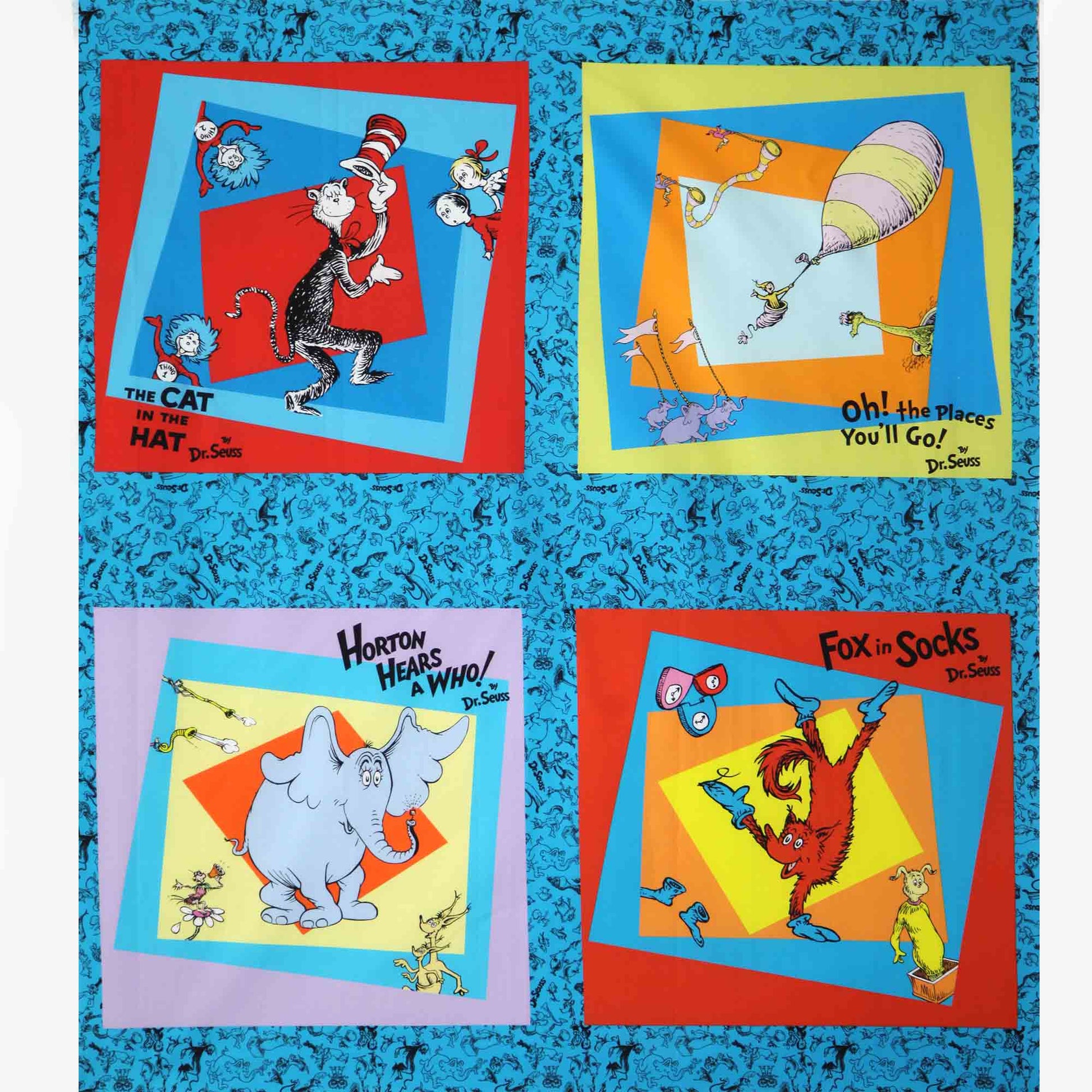 A panel of four panels - The Cat in the Hat; Oh, the Places You'll Go; Horton Hears a Who and Fox in Socks (my favourite) - each square measures 41cm wide x 40cm tall