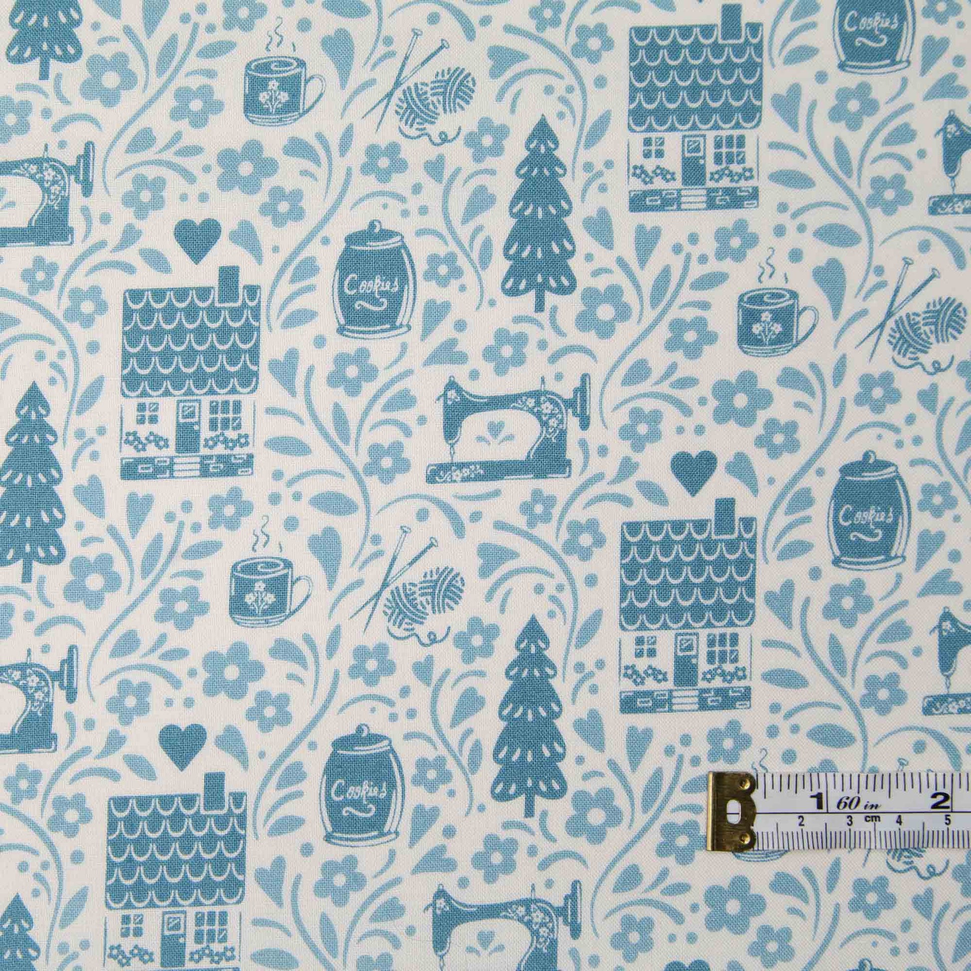 Off white fabric printed in delft blue all the essentials of sewing - a sewing machine, cookies and a mug of tea