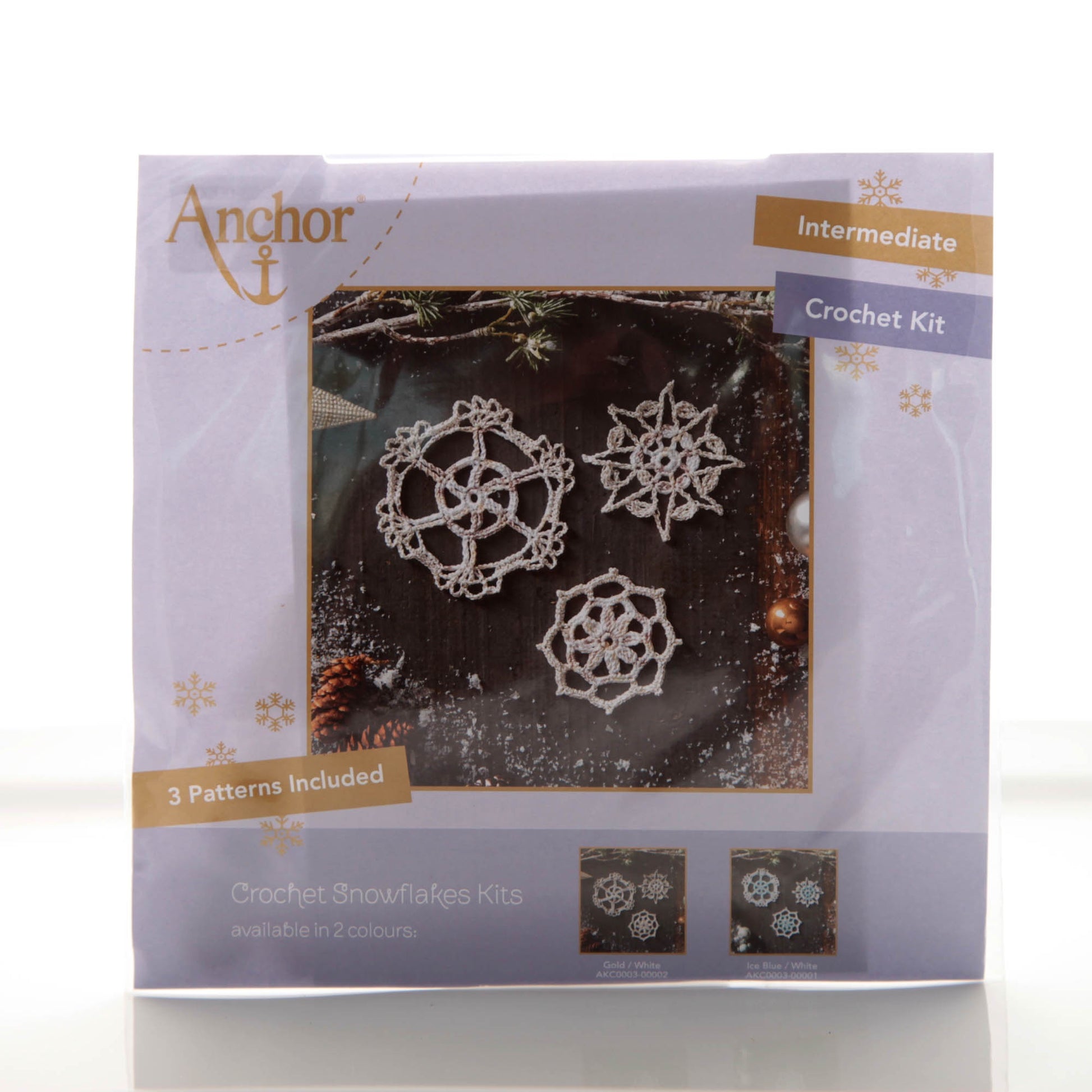 Kit includes three crochet snowflake patterns, two skeins of Anchor Pearl cottons (variegated and gold), and instructions