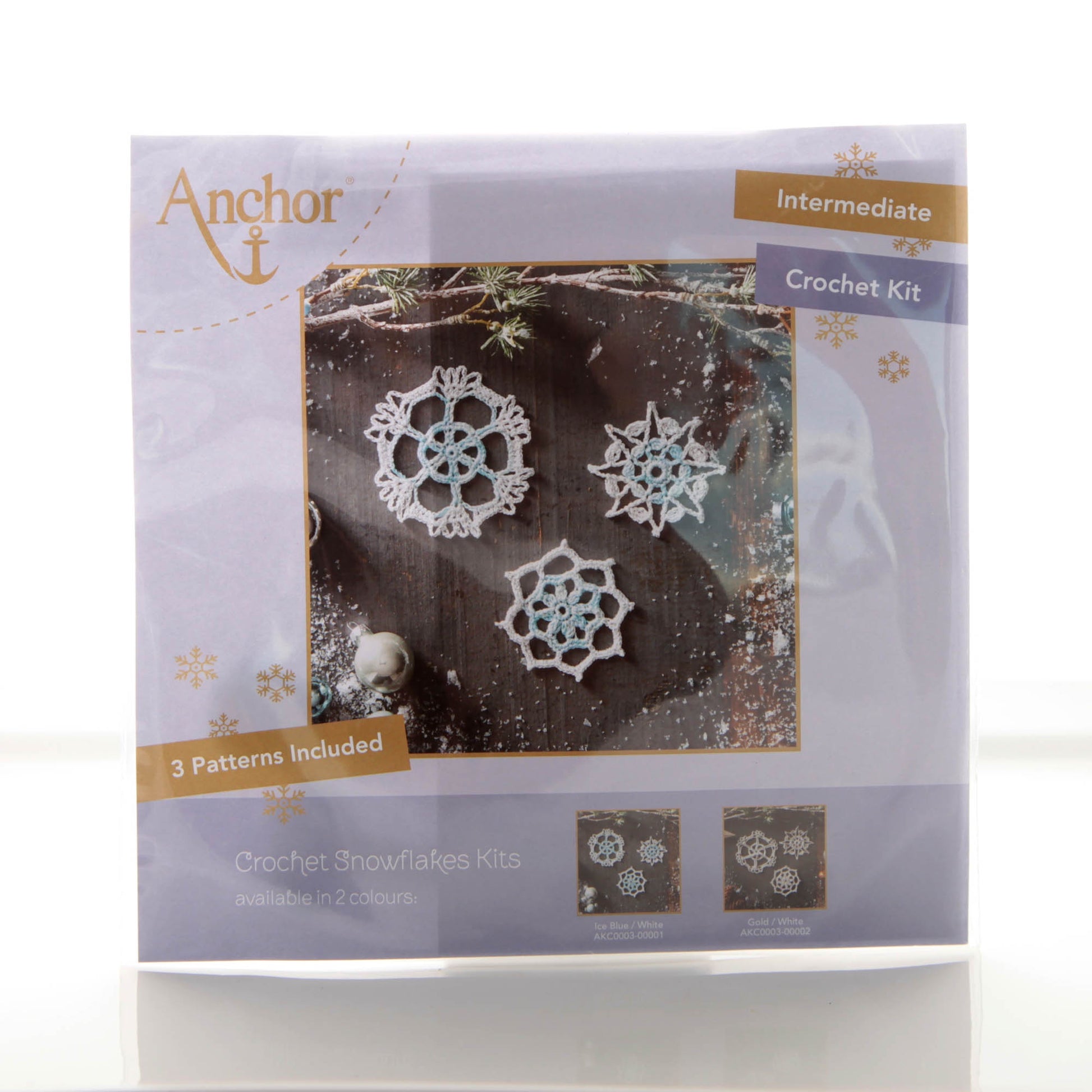 Kit includes three crochet snowflake patterns, two skeins of Anchor Pearl cottons (variegated and gold), and instructions
