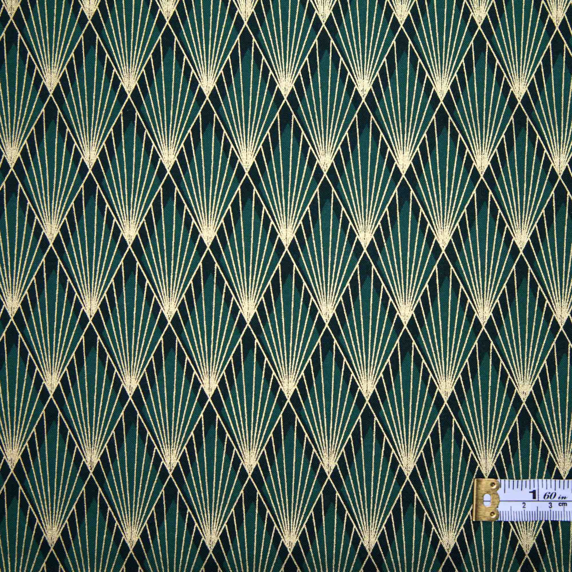 Just in time for Christmas making is this Art Deco style fabric with shades of Christmas green with metallic gold geometric printing