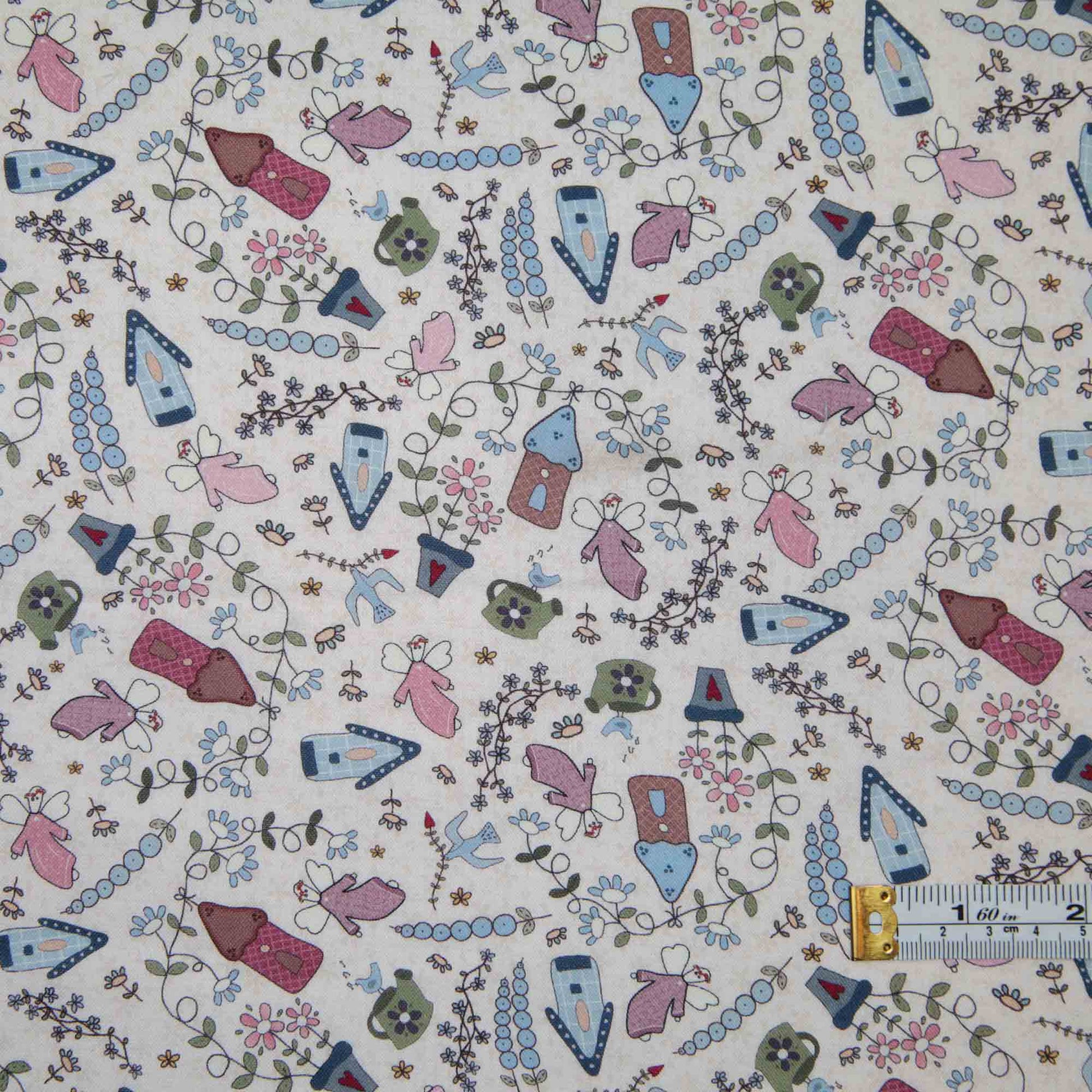 Lynette Anderson's latest collection and she's back to the more muted pastels that she's known for. Beige/cream background makes the scattering of bird houses, fairies, birds and fauna pop