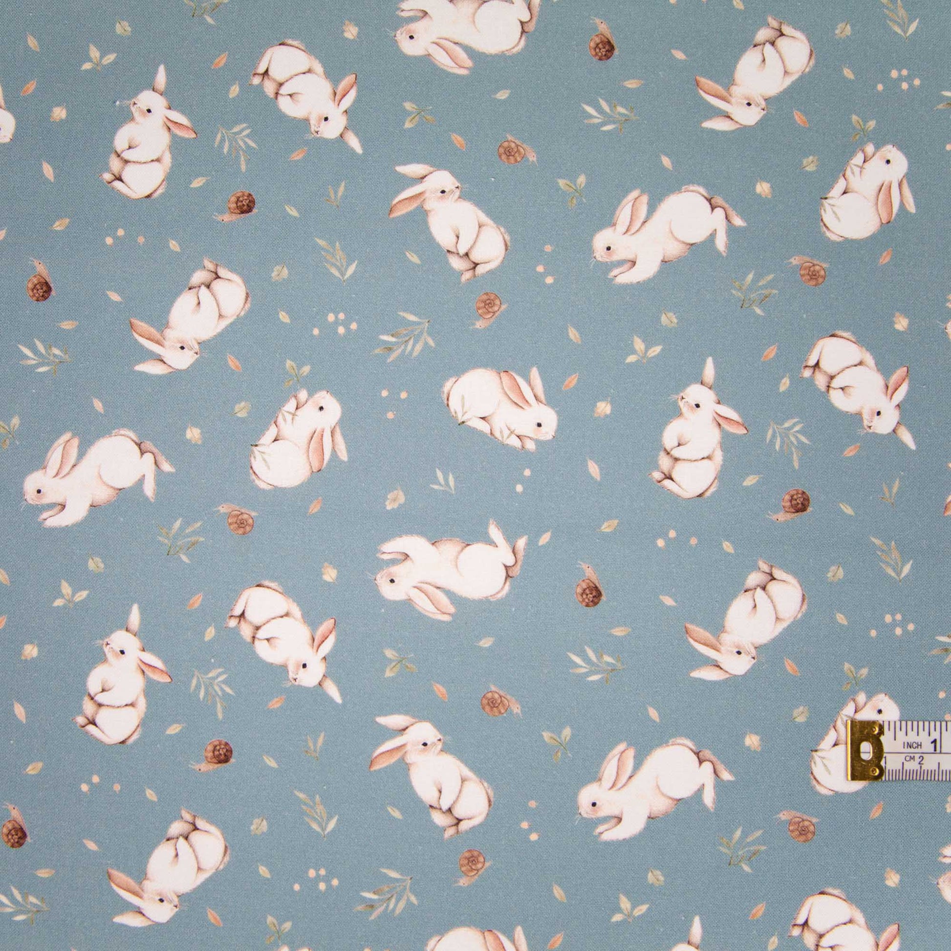 Blue grey background with a 'fluffle' of rabbits - yes, it's true, Google it