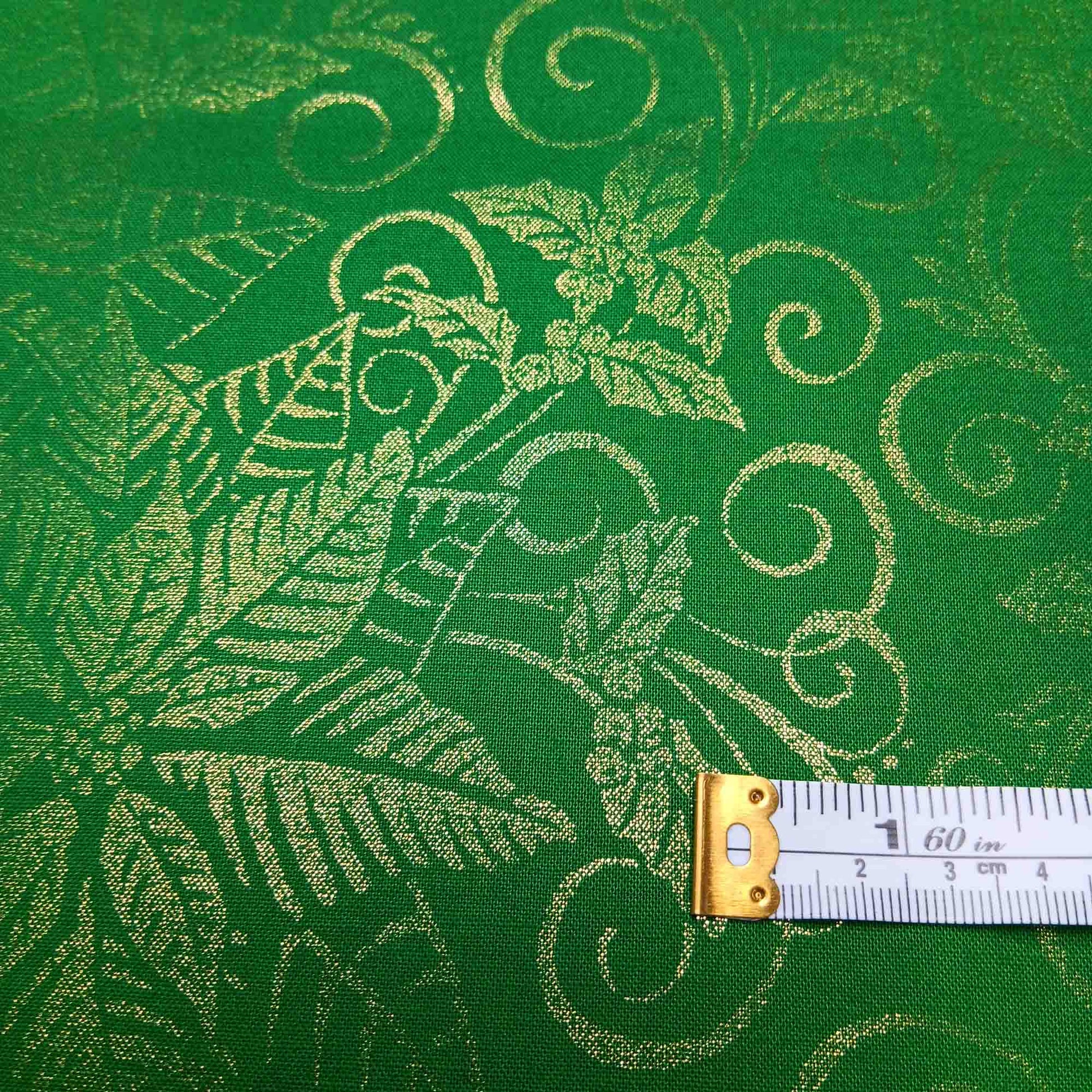 Emerald green background with metallic gold printed Christmas poinsettias, holly etc