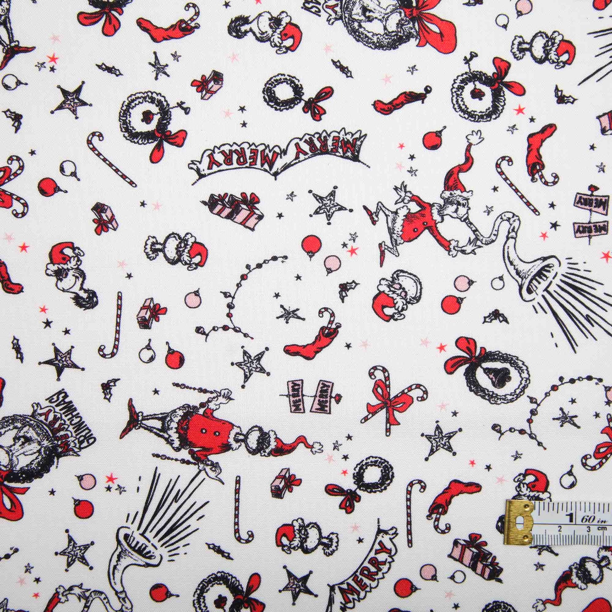 White background with the Grinch posing amongst an array of christmas objects. As featured in the Xmas classic from Dr Seuss, How the Grinch Stole Christmas.