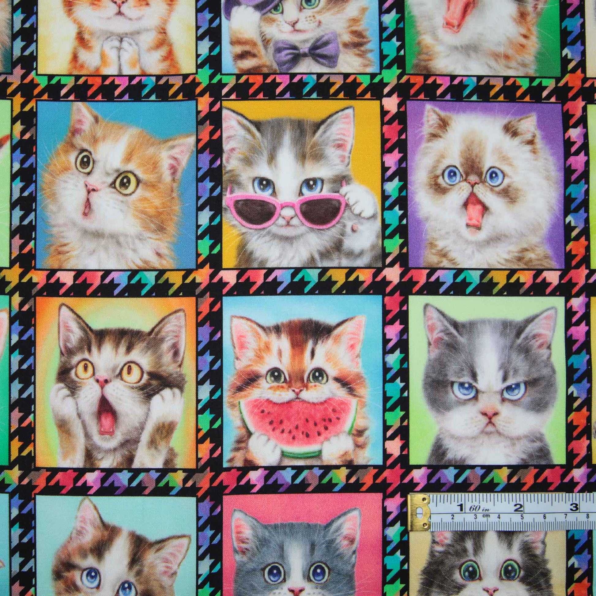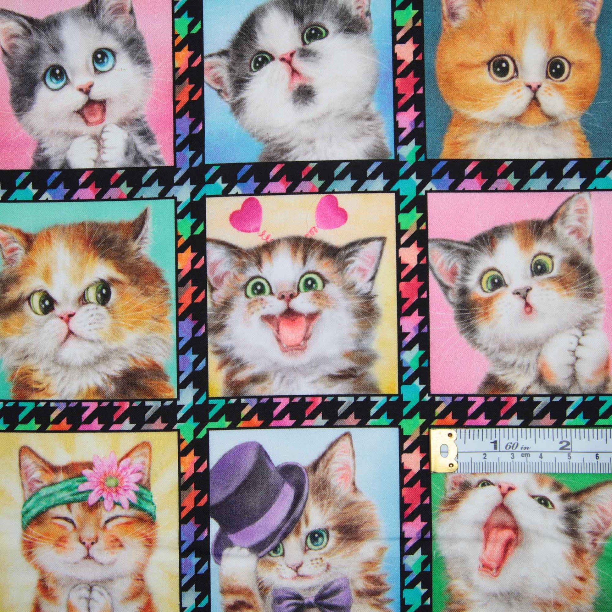 Blocks measure 7cm wide x 7.5cm tall. 13 blocks across and pattern repeat is 60cm long. Yes, there are blocks repeated but some of the kitties appear only once - looking at you ninja kitty.