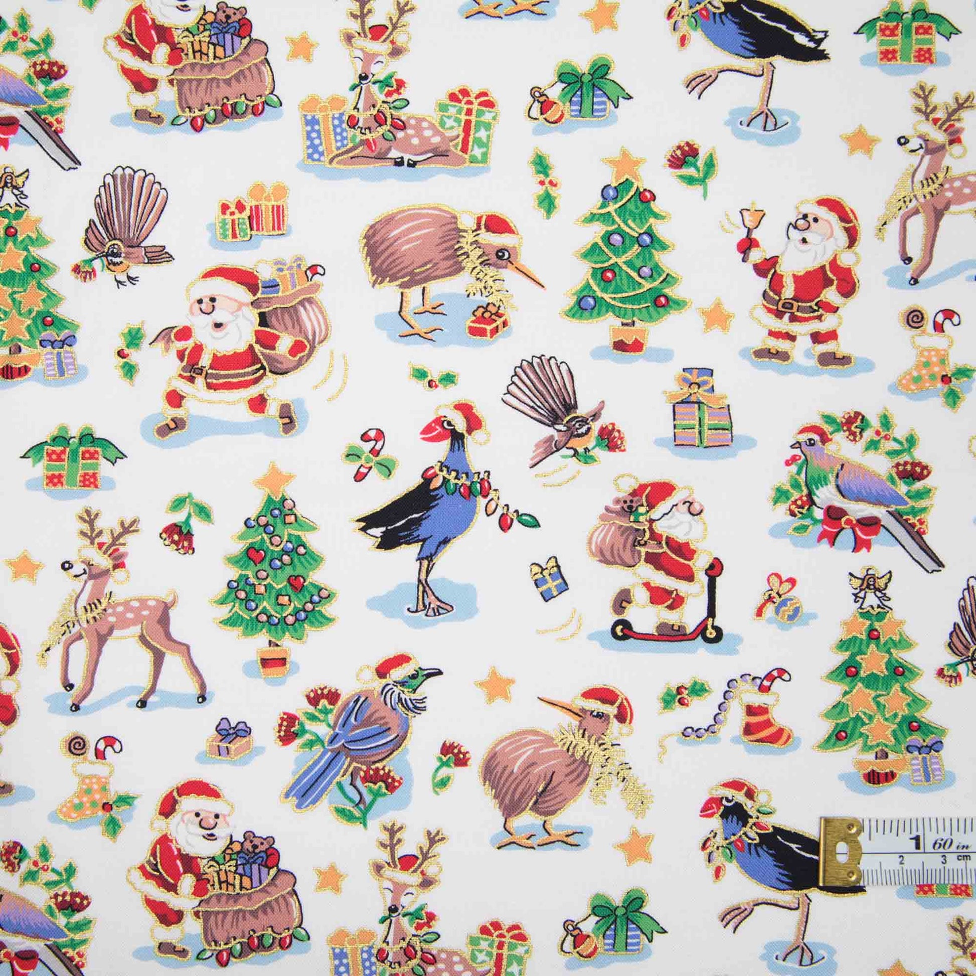 White background with a mix of Christmassy icons including Santa, reindeer, wrapped pressies and Christmas trees. Native birds - Tui, Kereru, Kiwi, Pukeko and Piwakawaka add a touch of 'Nuw Ziland' to this one.