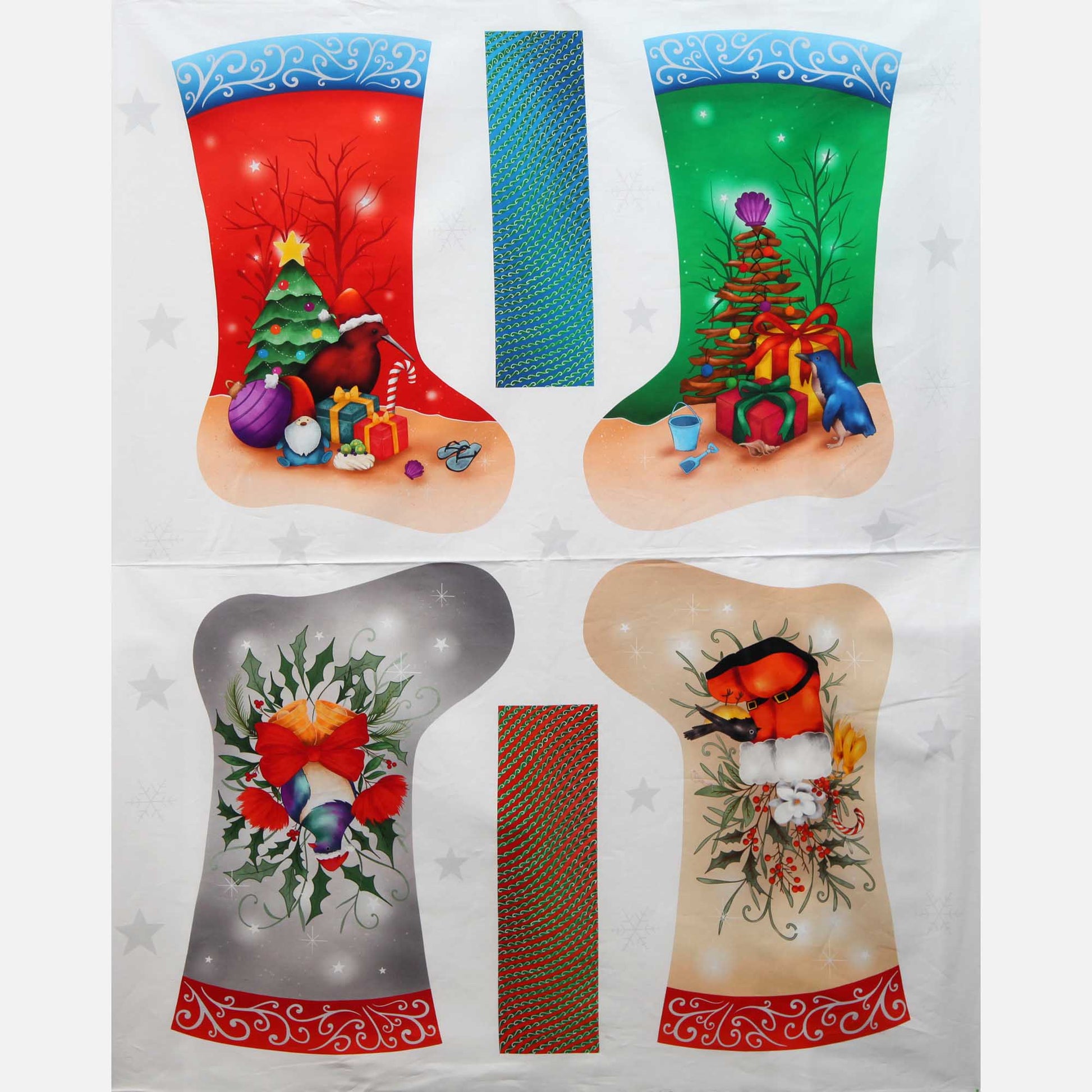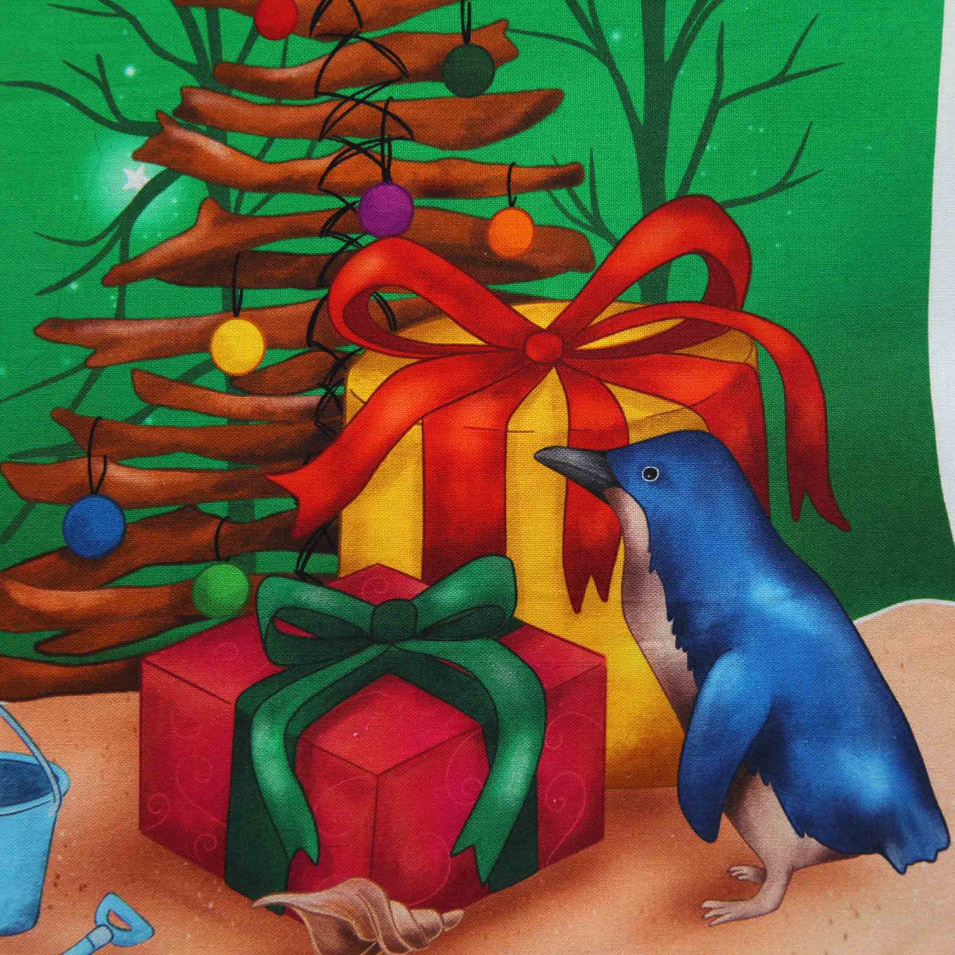 Panel measures 112cm x 90cm wide. You can make two stockings measuring 50cm long with four different images: kiwi under a tree, Little Blue Penguin (Korora), Kereru and fantail (Piwakawaka)