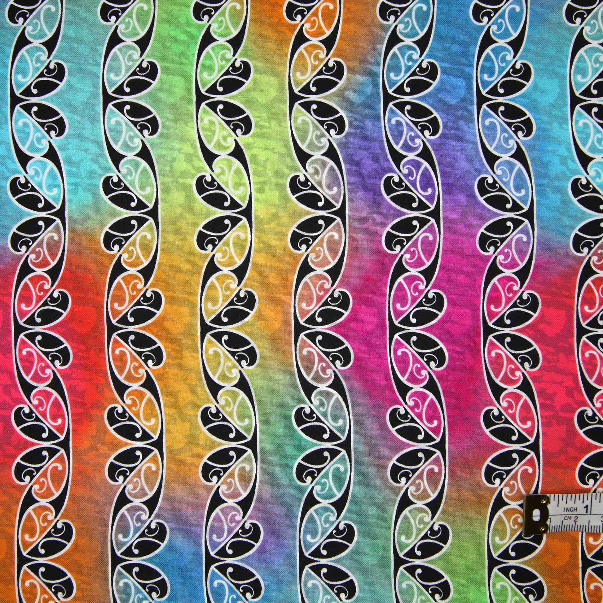 Lines of Koru on a multi-coloured background