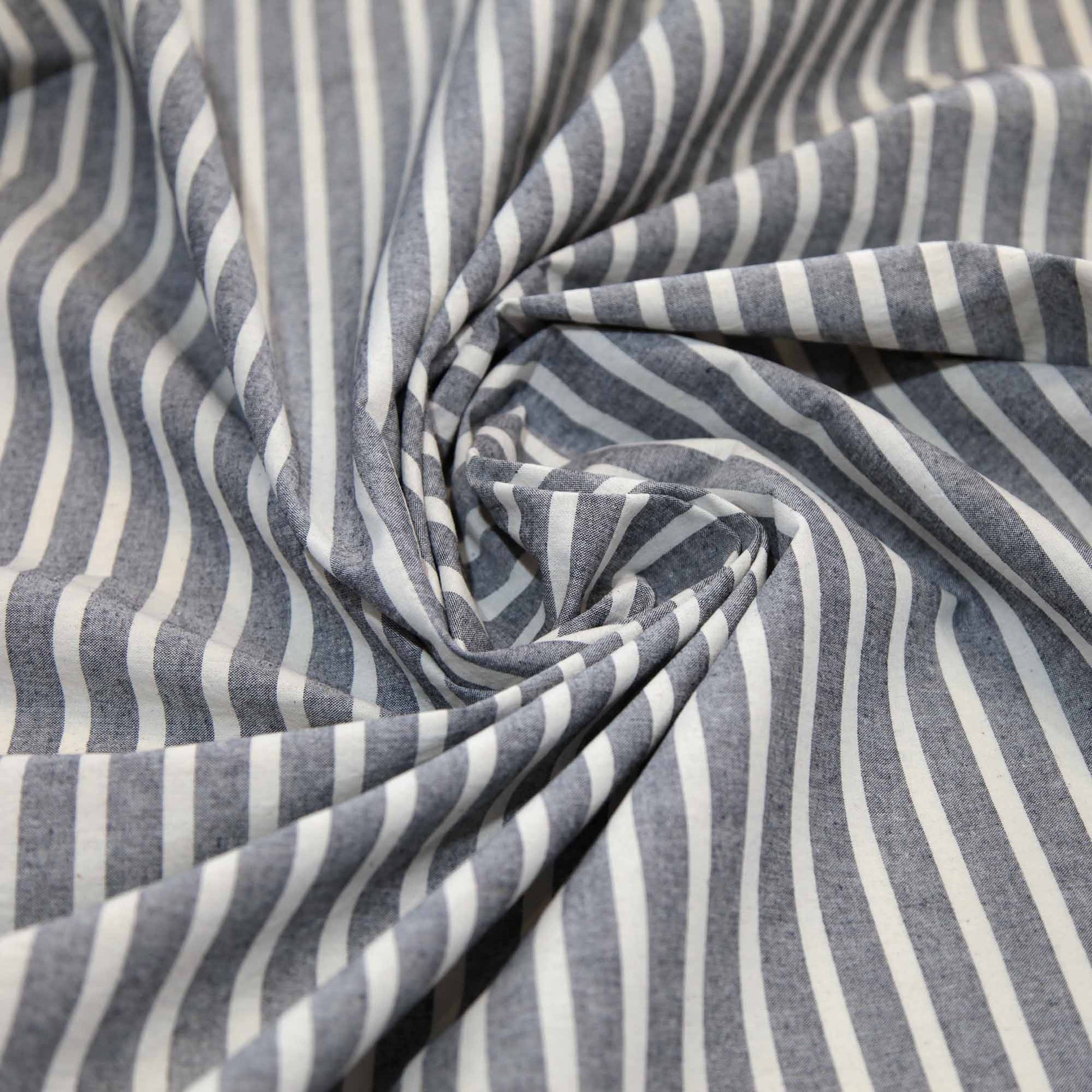 Classic linen stripe in cream and soft navy blue. Woven not printed and you can see the seeding in the fabric and slub