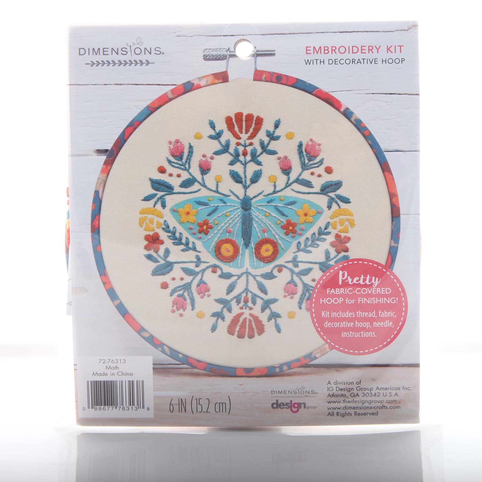 Moth embroidery kit with floral decoration. Hoop has been -pre-wrapped in a blue and floral fabric - perfect for hanging on the wall when you have finished stitching.