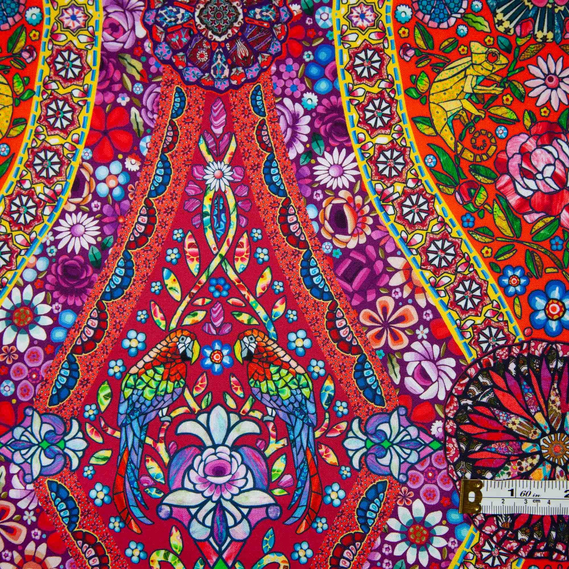 Lovely bright colours just like a stained glass window with the light behind it - predominantly reds and maroon with chameleons and parrots