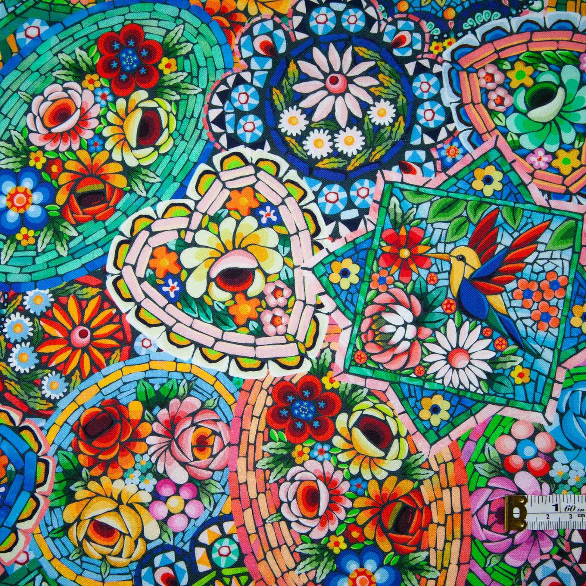 Lovely bright colours just like a stained glass window with the light behind it - predominantly yellows, greens and a bit of pink with hummingbirds
