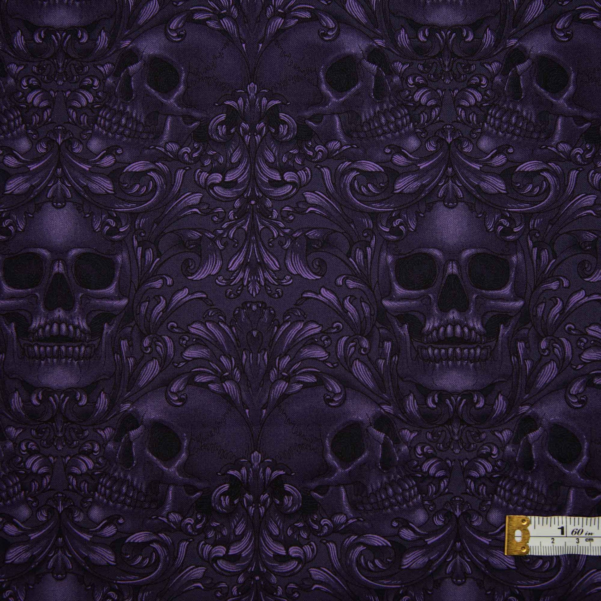 Detailed purple and black skulls surrounded by light and dark purple filigree