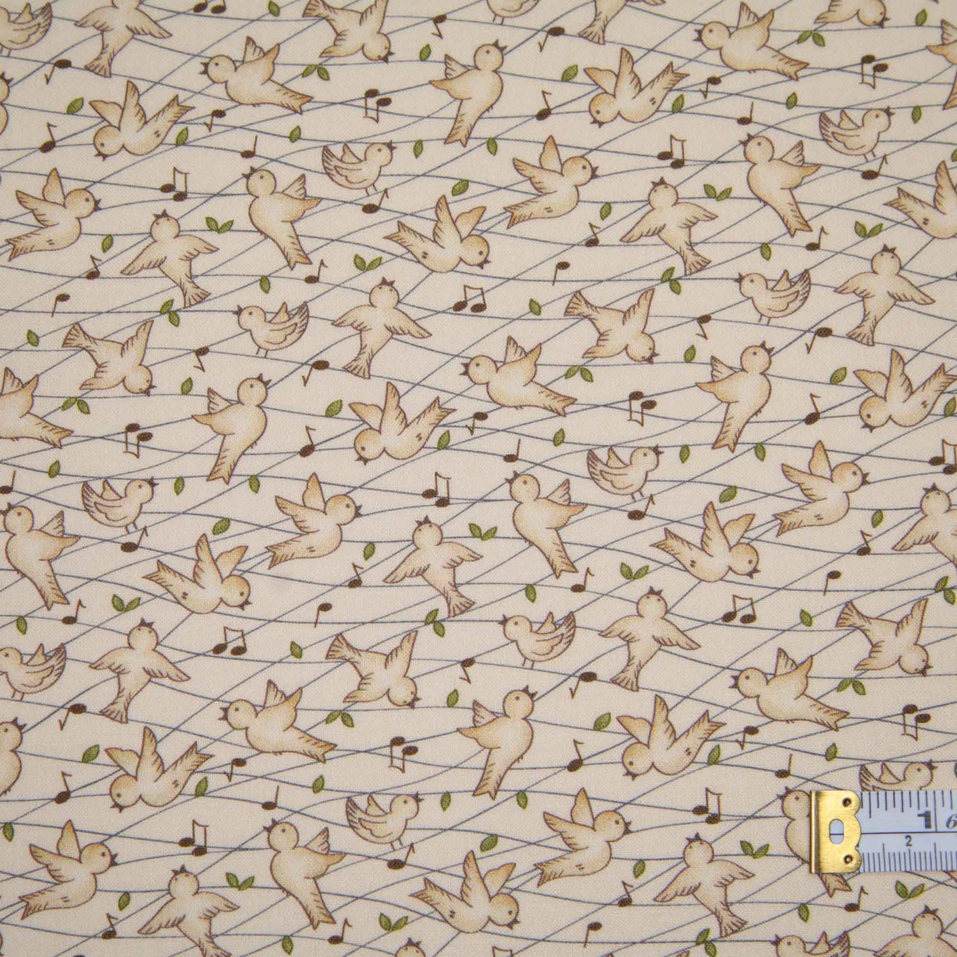 Pale mustard yellow background with lots of birds tweeting - tiny musical notes and green leaves