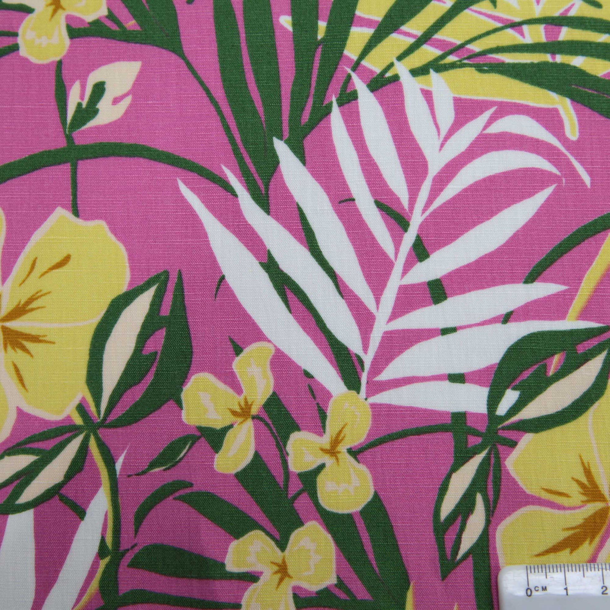 Summer weight printed linen/viscose fabric with a pink tropical theme. Natural fibres so will be cool to wear on the hottest day