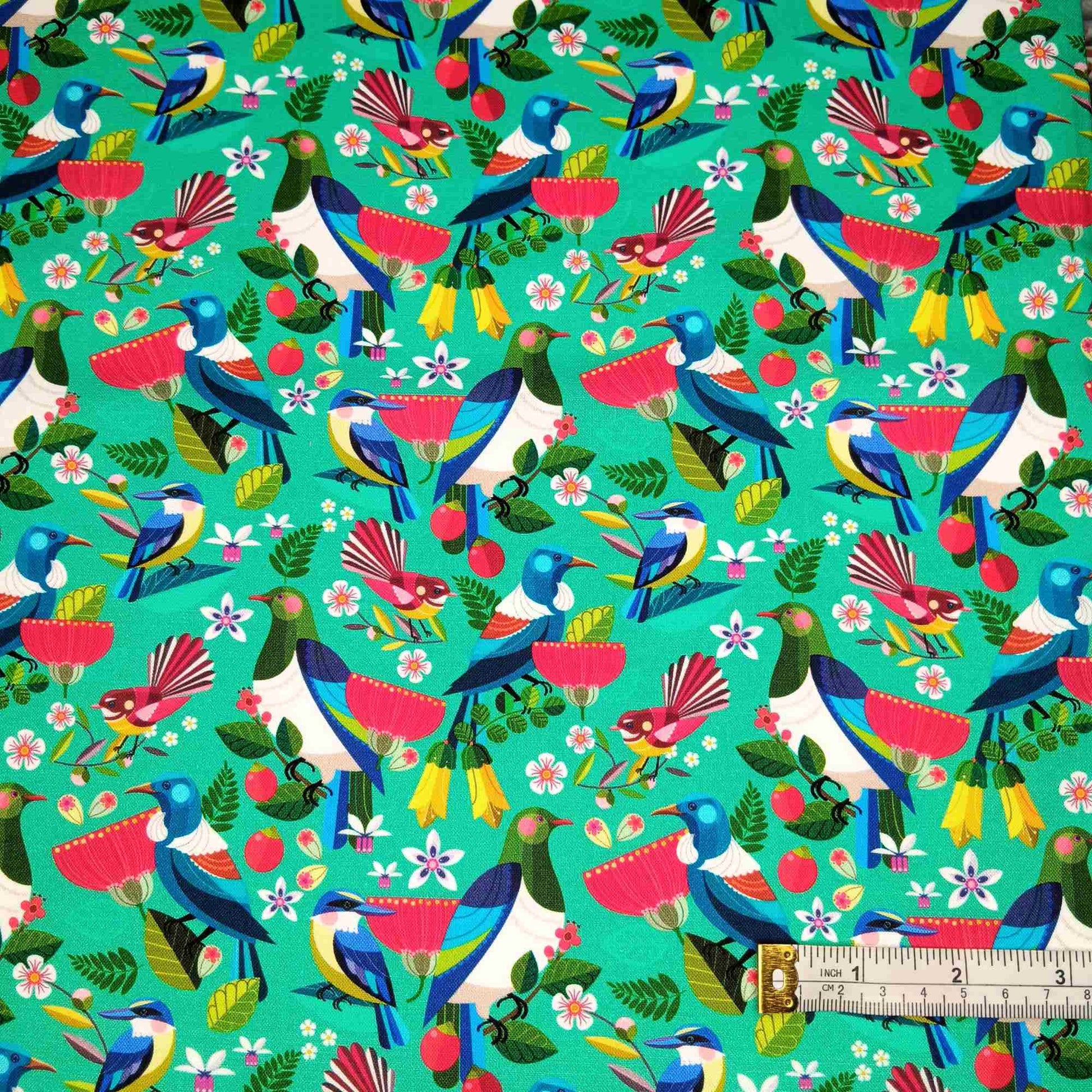 As you would expect the colours on this fabric are especially vibrant; the bright mint background makes the colours of the Kereru, Fantails, Tui and Kingfishers really pop