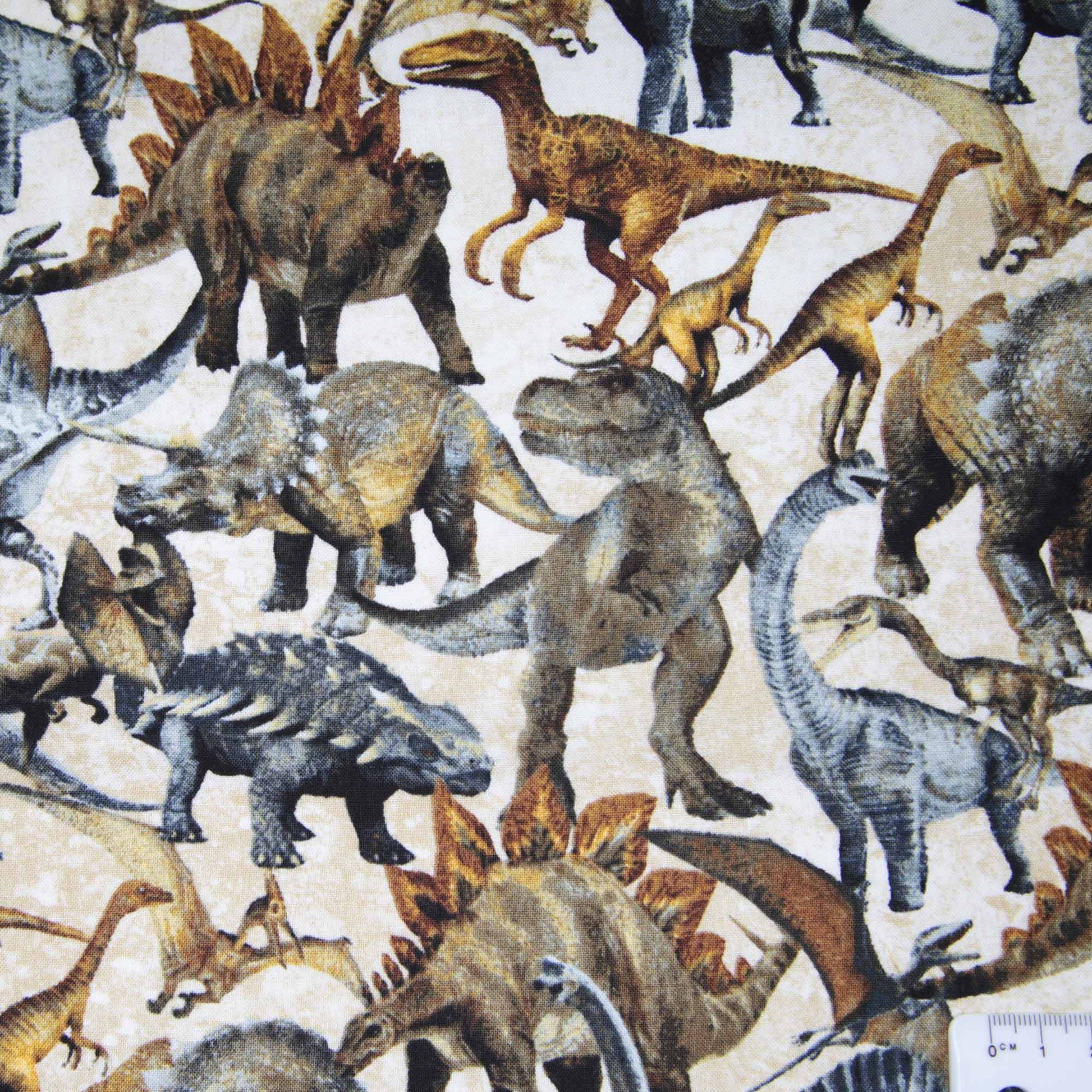 Lots of dinosaurs in shades of brown and grey on an off white background