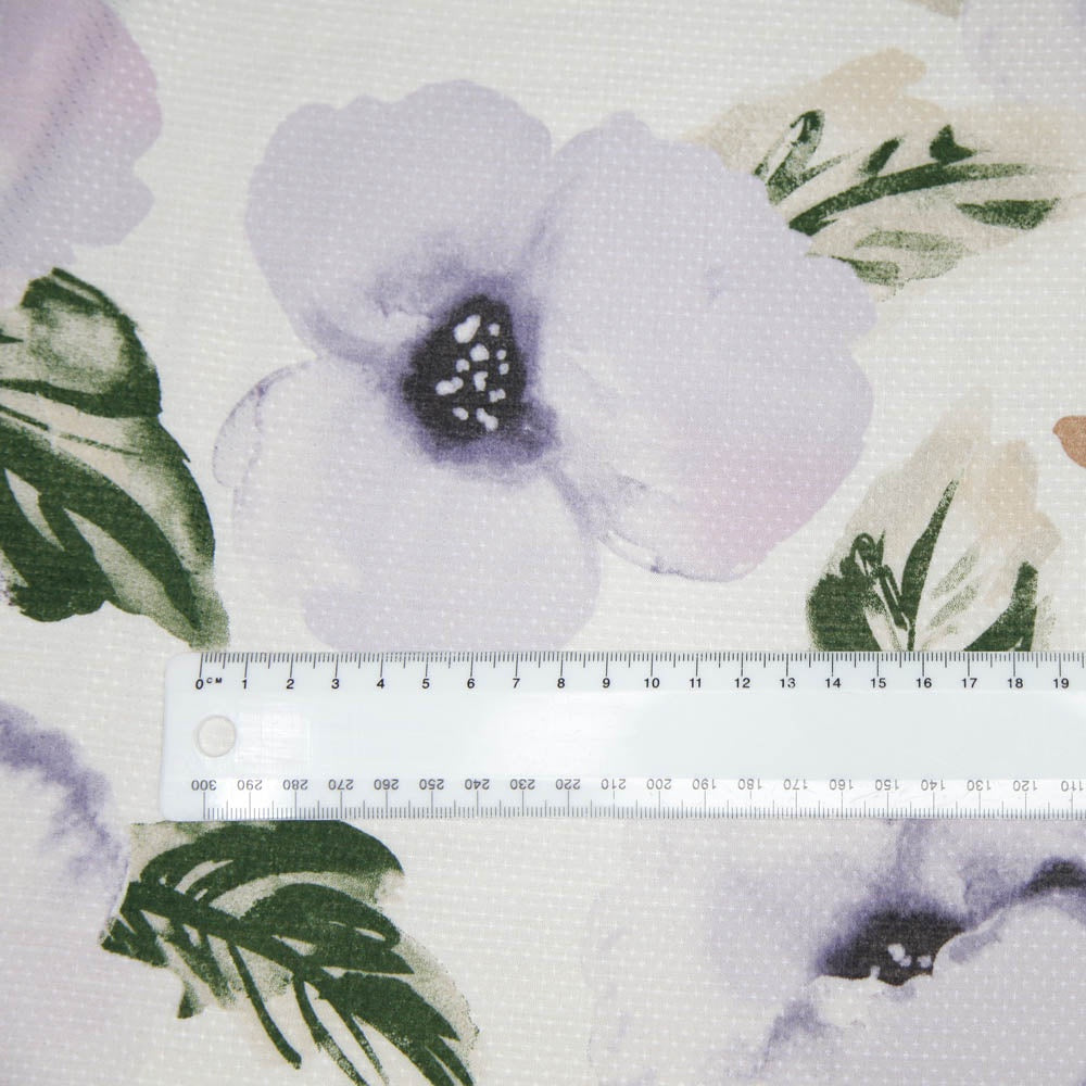 White background with printed large lilac/purple flowers and green leaves. Fabric has tiny crosses in a regular pattern giving the fabric a soft grid texture