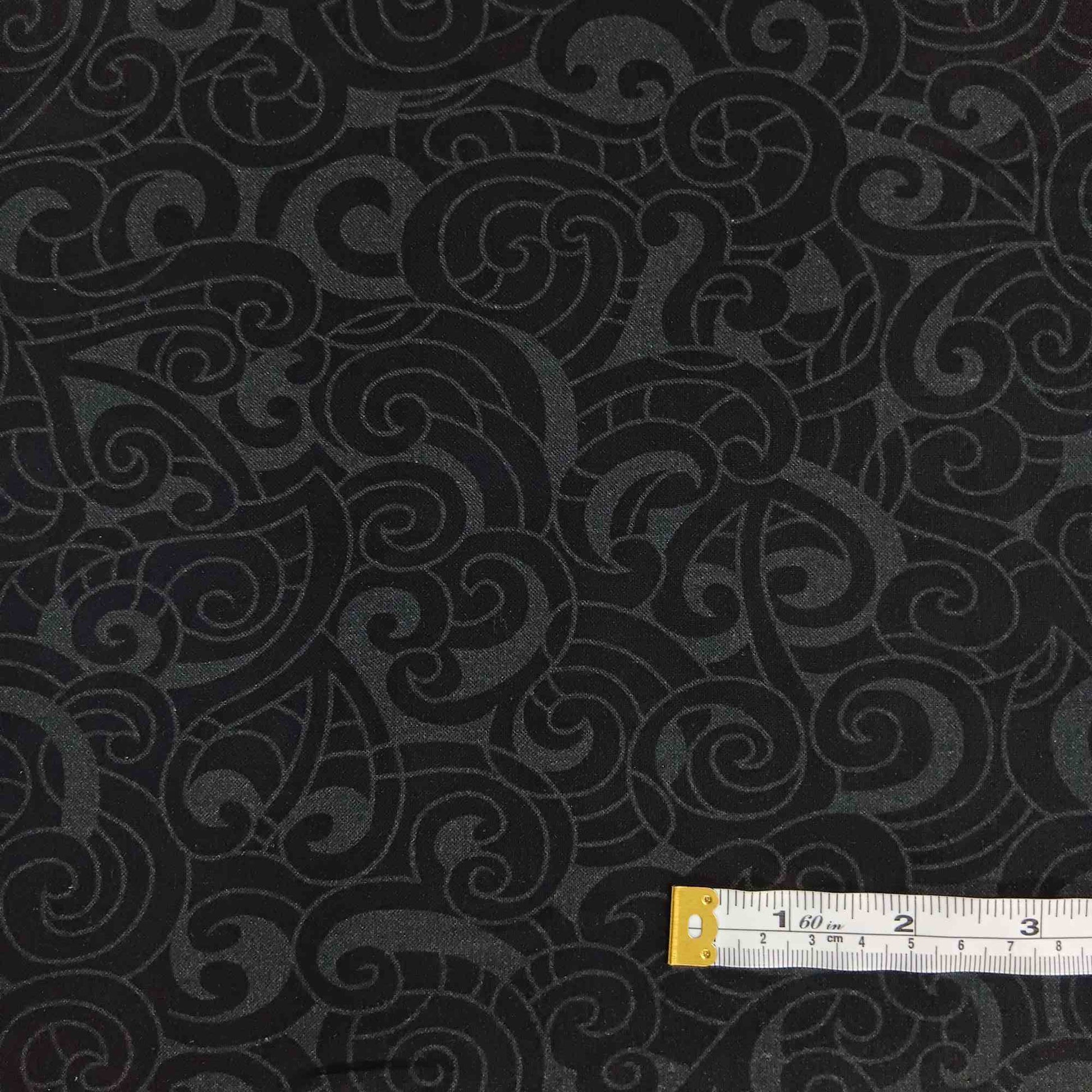 Almost black print on black fabric of intertwined koru