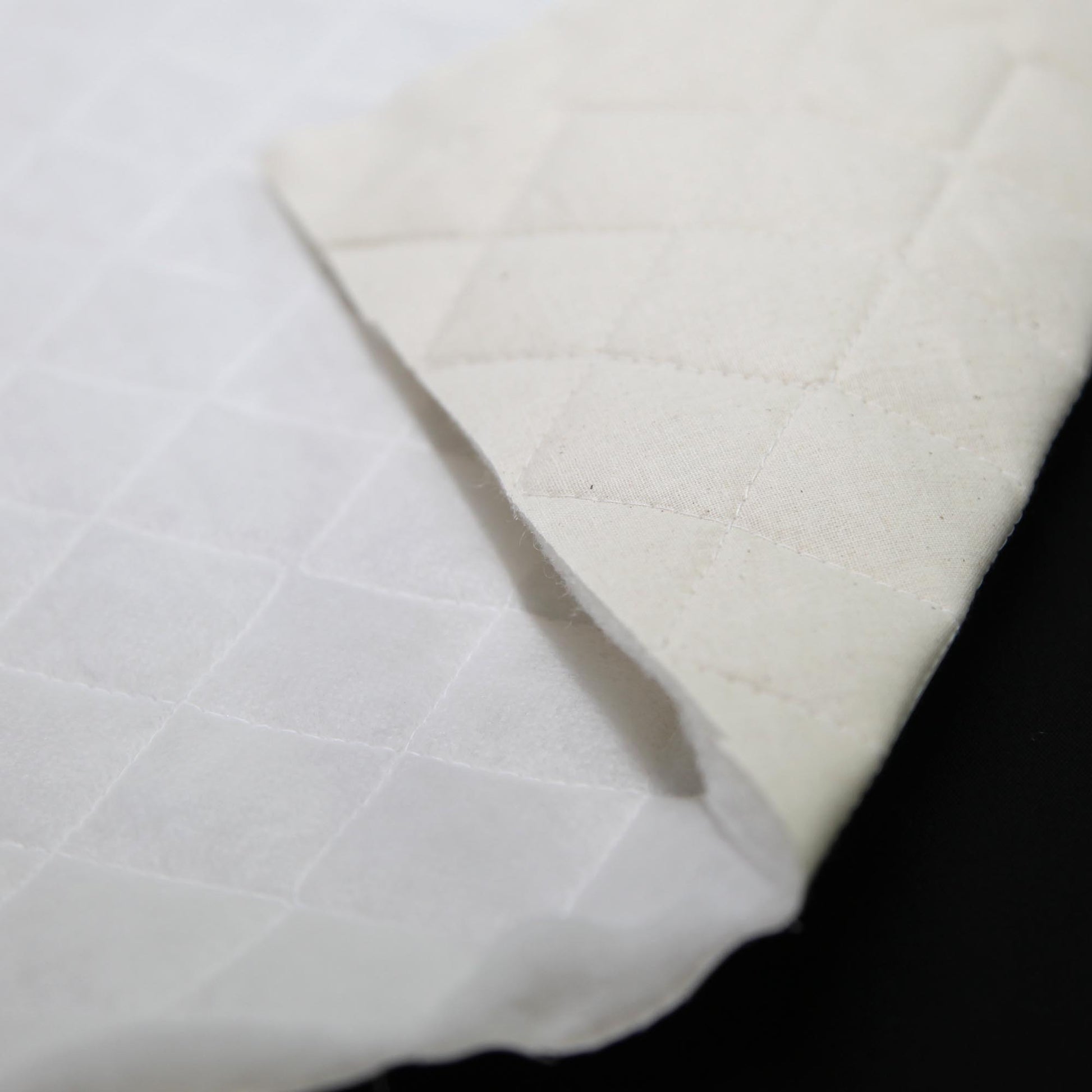 Unbleached 100% cotton calico on top, polyester wadding in the middle, white polyester on the back and then quilted in a cross hatch pattern