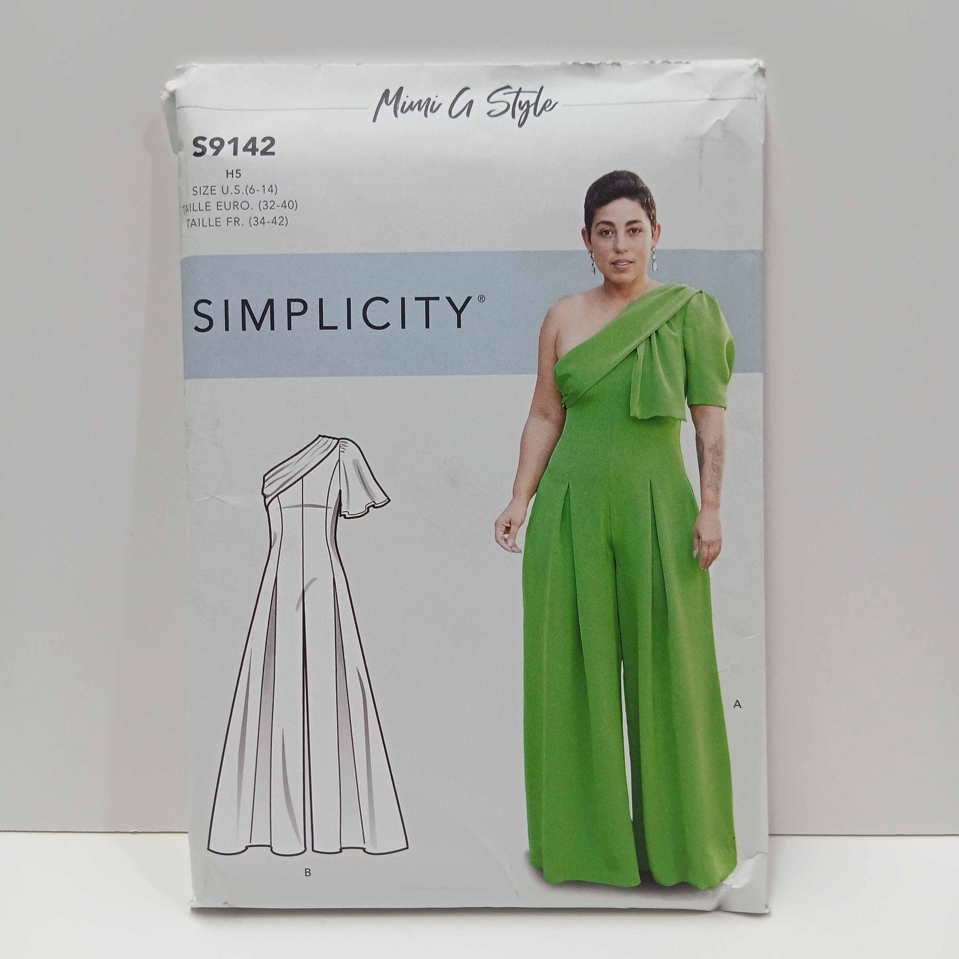 Misses jumpsuit with one shoulder drape detail, puffed or flared sleeve and length variations