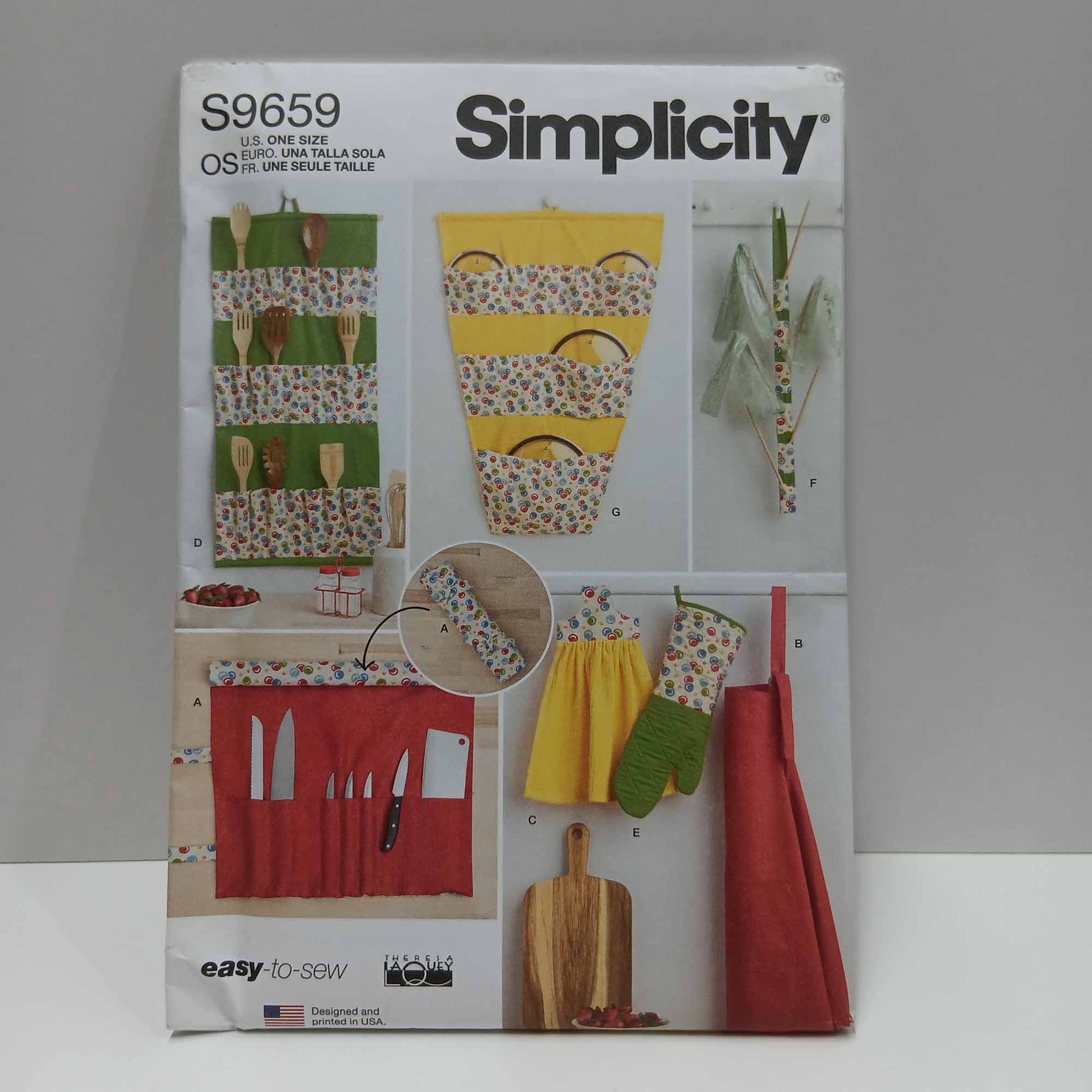 Knife roll, apron, hanging towel, utensil holder, oven mitt, plastic bag dryer, pot lid holder