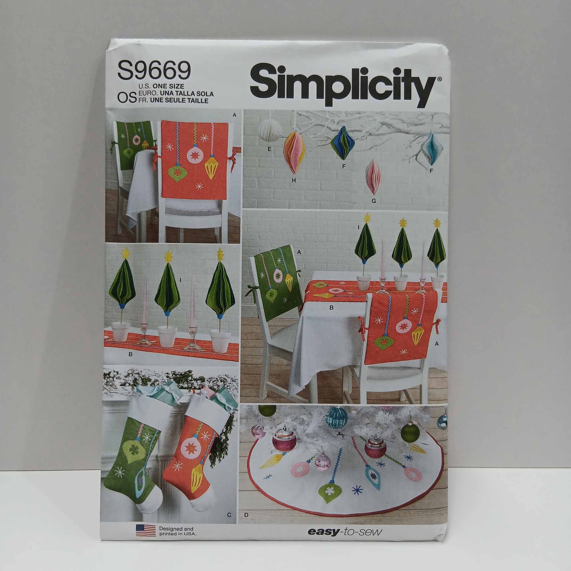 Holiday decorations in a more contemporary style - chair scarf, runner, stocking, tree skirt, ornaments and tree decoration