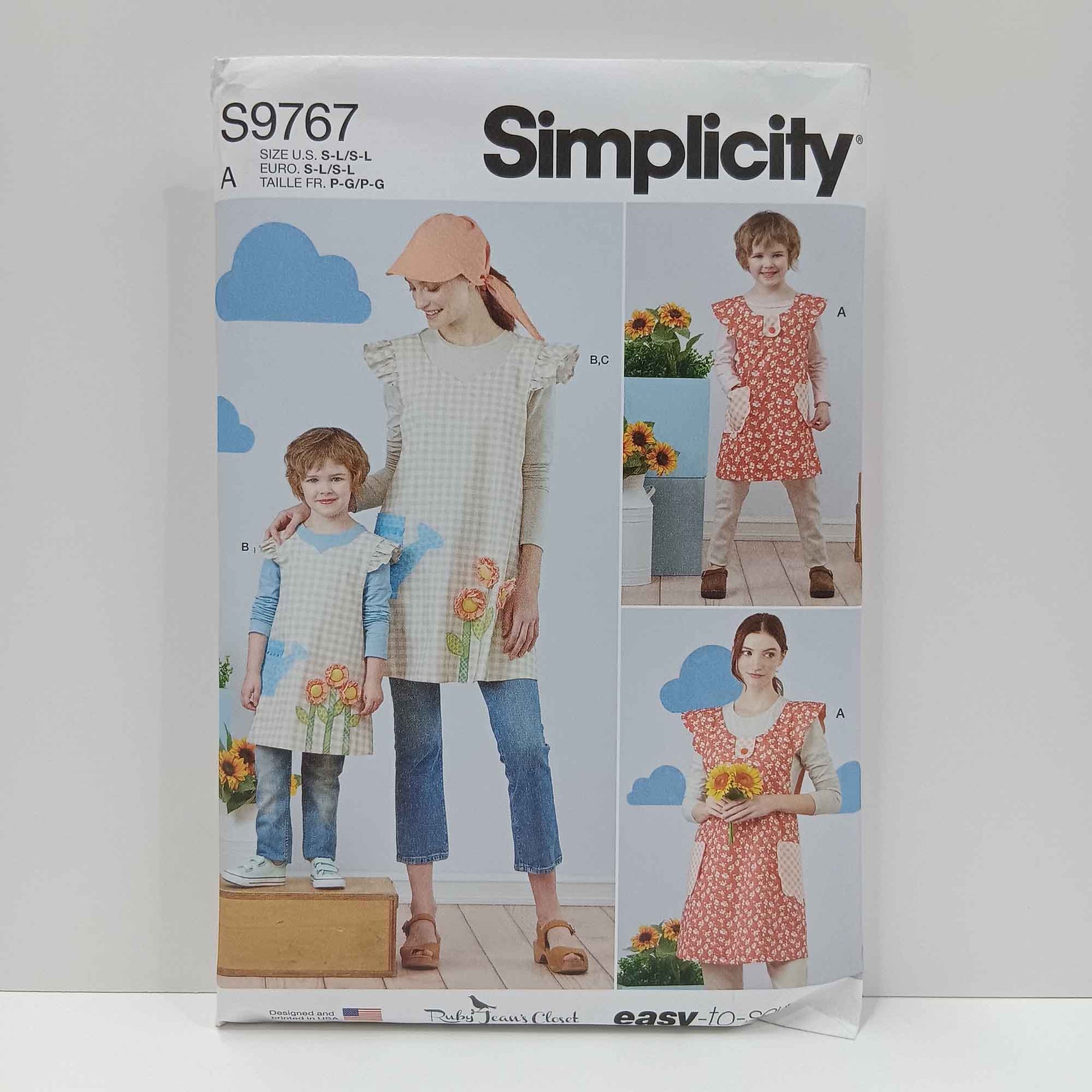 Two wrap around apron options with applique pockets in both kids and adult sizes plus head scarf - Children's sizing 3-8 years Adults sizes 8-18