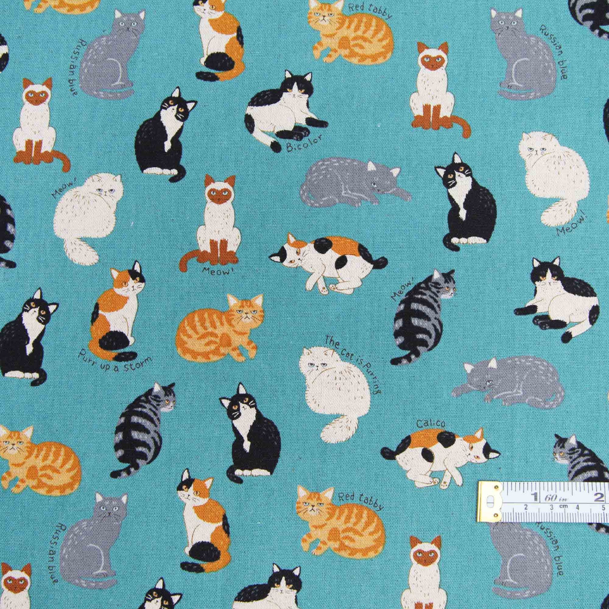 Tossed kitties with captions on a dark teal background. The added linen makes this a slightly heavier fabric suitable for upholstery and furnishings