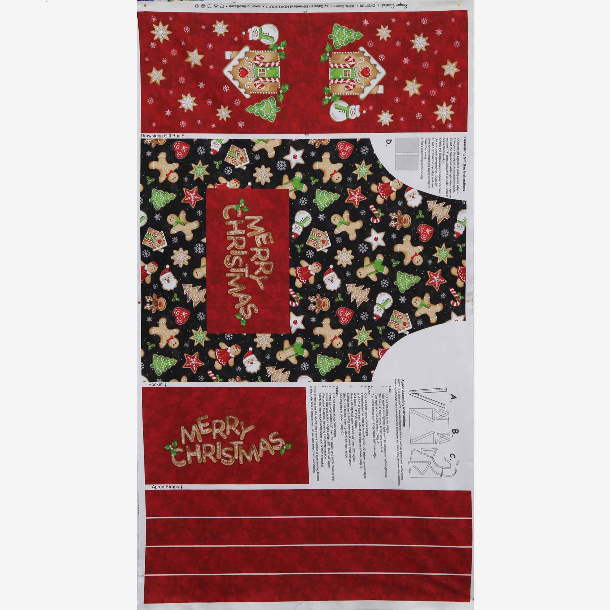 Make a child's Christmas apron with front patch pocket and ties as well as a cute drawstring bag. All pre-printed and includes instructions