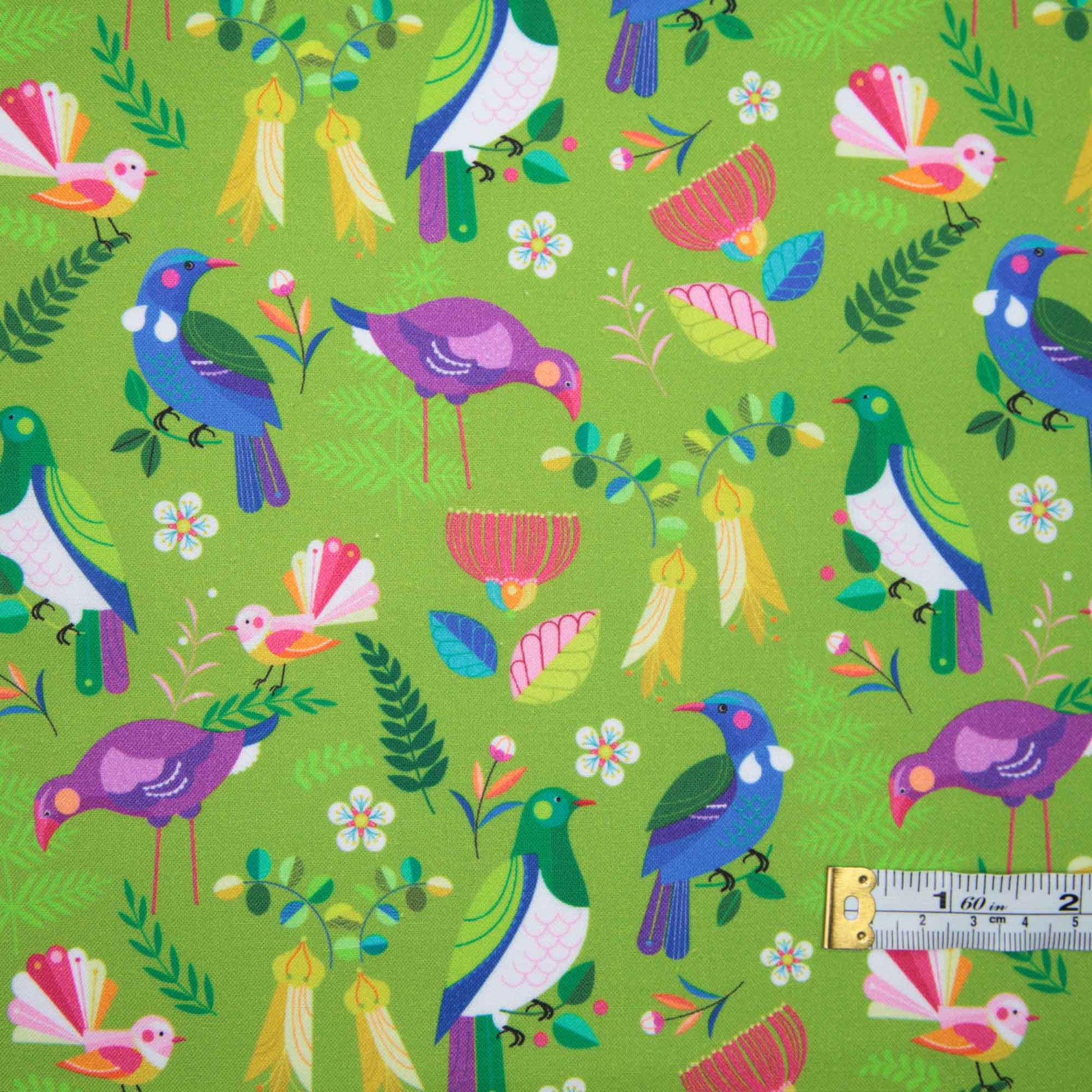 From Ellen Giggenbach - native birds (Tui, Piwakawaka, Kereru, etc) surrounded by native blossoms on a lime green background