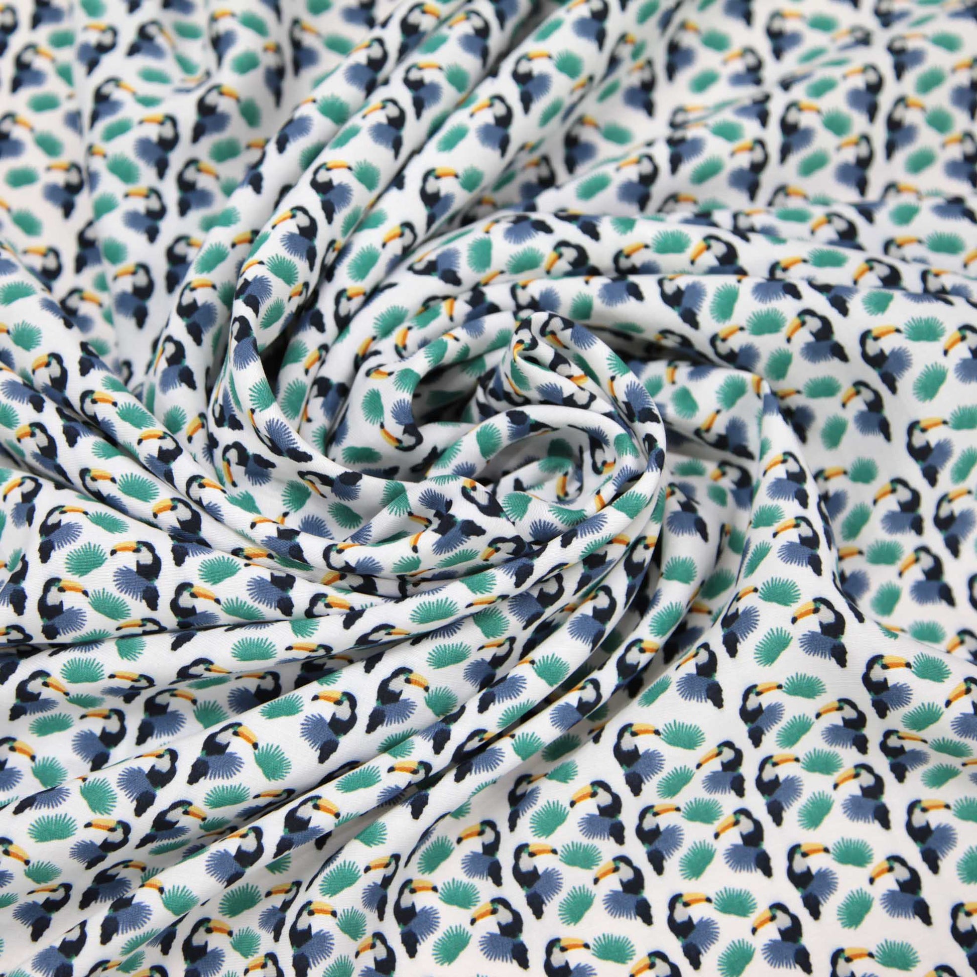 Plain white background with black, blue and yellow toucan birds with a green palm leaf.