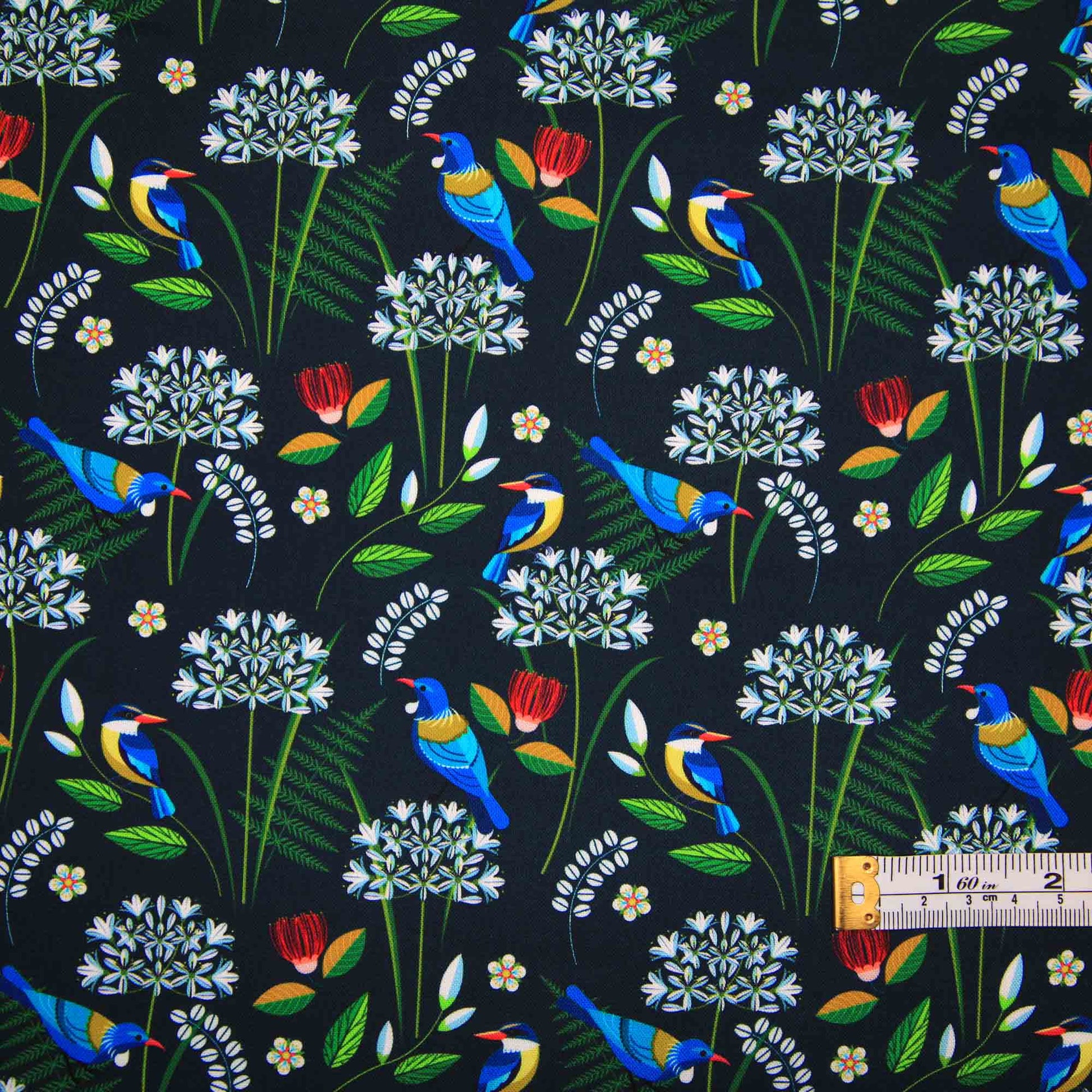 Ellen G's spendid mix of NZ native birds, flora, fauna and insects in her trademark bright, bold colours on a dark green background. Tui and Kotare (Kingfishers) with their bright teal plumage stand out on the very dark navy background