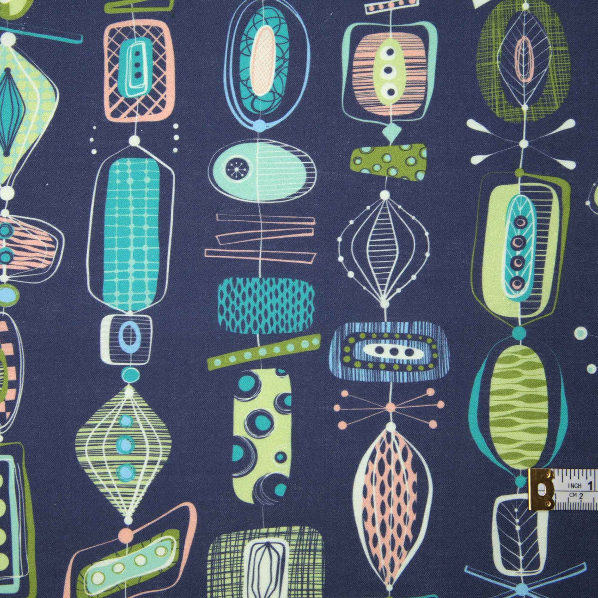 Navy blue background with vertical lines of retro/space/geometric designs - this is the full 70's vibe and I love it
