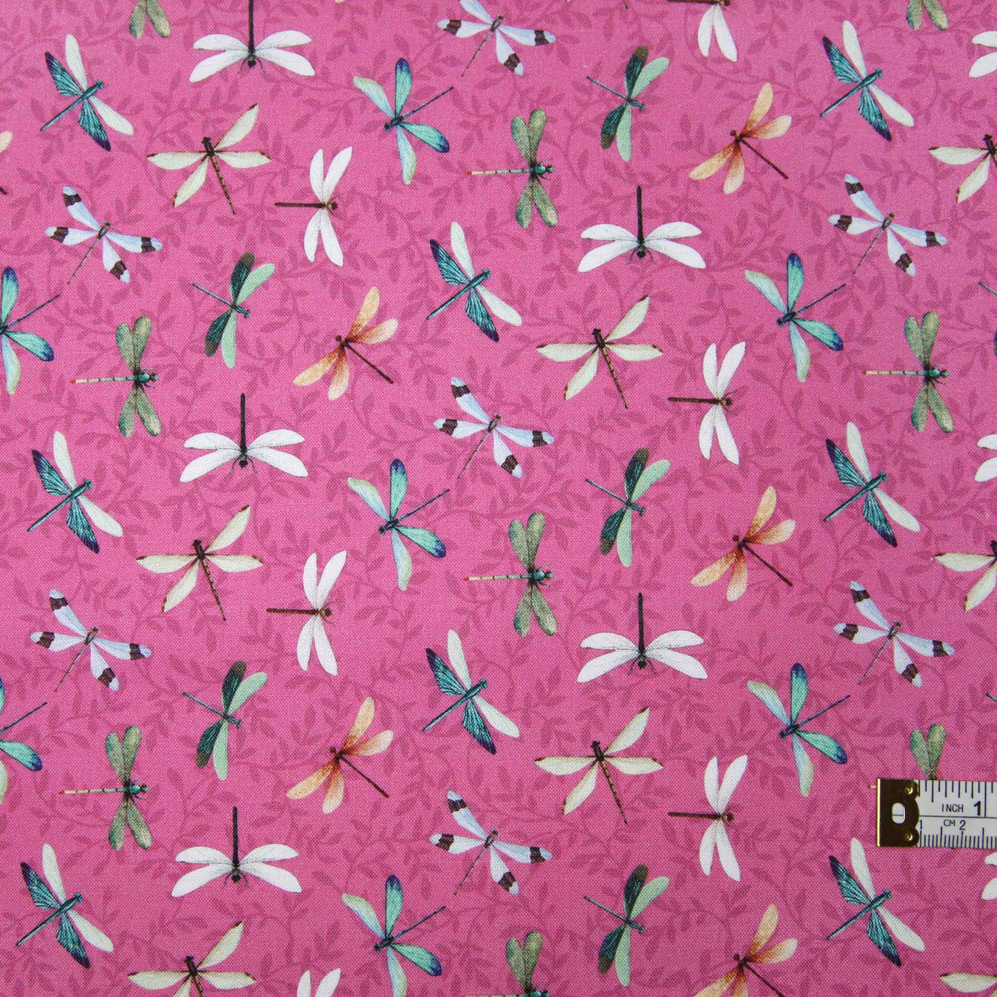 Pink background with scattered, colourful dragonflies - digital print so the details in the dragonflies are amazing